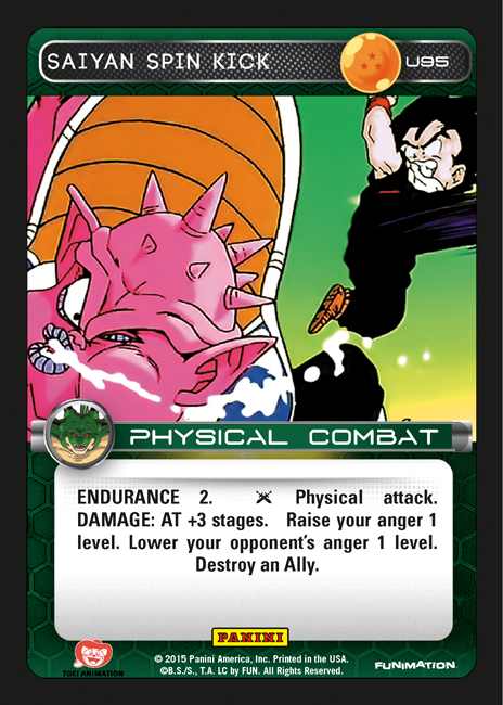 First and foremost, it provides tempo oriented beatdown decks with a net +/- of three anger levels. Its damage output of AT +3 stages is reasonable, and Endurance 2 adds even more utility. Taking all of that into account, Saiyan Spin Kick is still noticeably useful even without the Ally destruction. Of course, it truly shines in matches where you can snipe a key card like Bulma – Genius or Captin Ginyu – Aggressive.