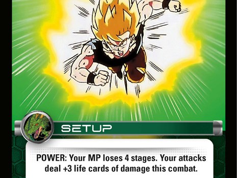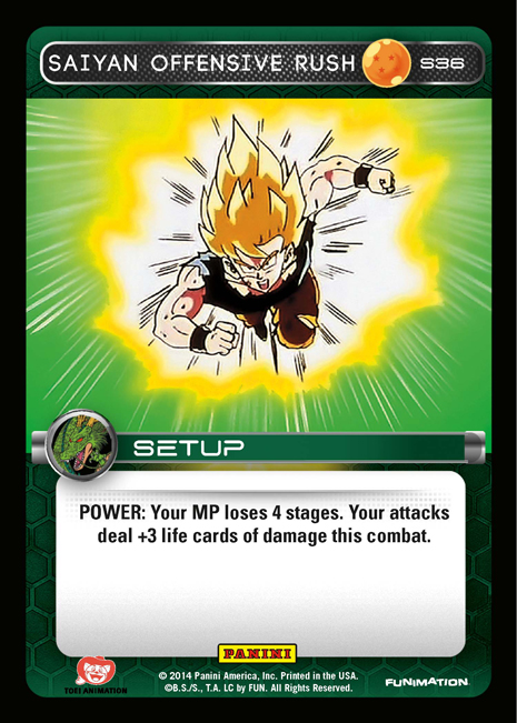 Saiyan is known for its aggressive offense, and most builds contain a low Setup count. When building a deck with Saiyan Offensive Rush, you might consider an alternative strategy based around setting up a few large combats. If you manage to activate two copies in the same combat, the game can end in short order!