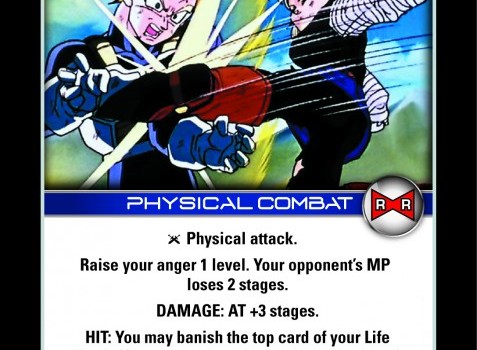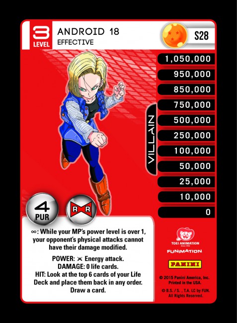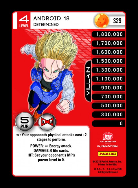 Android 18 – Directing starts off with a nice mix of offense, defense, and utility. Whenever you are more than 5 stages above zero, your opponent’s first physical attack will lose any “+” modifiers. While this can be played around, it is still useful simply for the fact that it disrupts your opponent’s sequencing. Her own attack does no damage, but it can soak up certain blocks or be modified to dish out a few Life Cards. Most of the time, it will go unblocked – allowing 18 to refill her hand with new options.