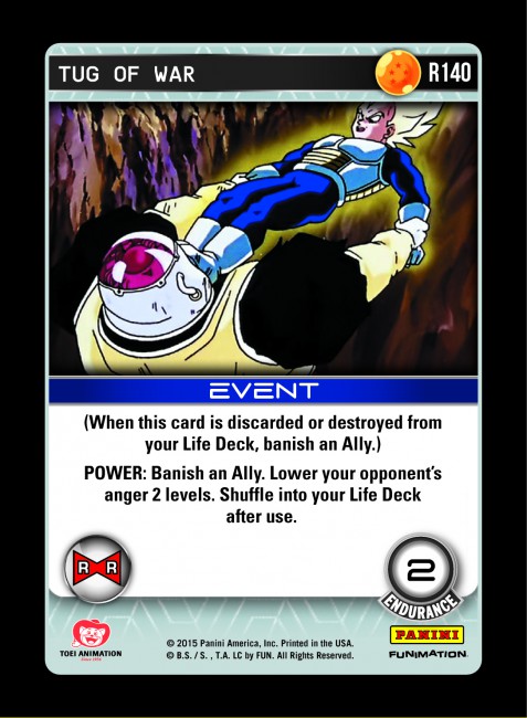 Finally, it shuffles itself into your Life Deck after use. This recursion makes it more likely for the parenthetical text to activate, and in a worst case scenario you have shuffled your deck and added some Endurance. The usefulness of shuffling your deck is often overlooked – even aggro can benefit immensely from access to Rejuvenated cards. The shuffling ability also has a favorable interaction with Namekian Knowledge Mastery, turning Tug of War into a mini anger control engine.