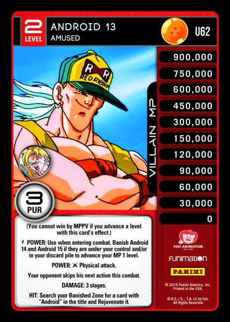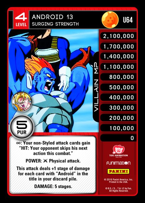 Android 13 – Dark Villain has a vicious “when entering combat” effect, and it chains directly from Level 2’s auto-advance. In addition, he packs a sizable 7 stage attack with the potential to shut down opposing Constant Powers.