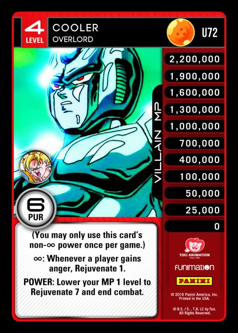 While Cooler – Overlord’s activated Power may only be used once per game, it is perhaps the strongest effect ever seen on an MP. A guaranteed combat-ender can greatly expand tactical options at the end of the game, and Cooler’s Life Deck will grow by 8 cards (including Level 3’s effect) whenever he is near death. While waiting to pop down, the Constant ability provides more Rejuvenation – and decks with consistent access to anger are able to extend the game even further.