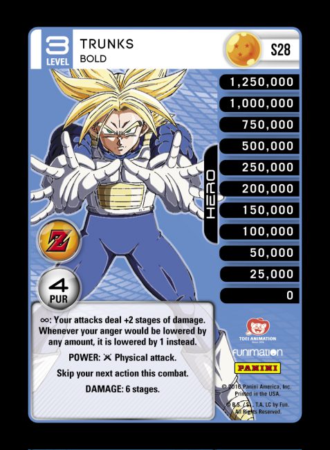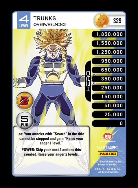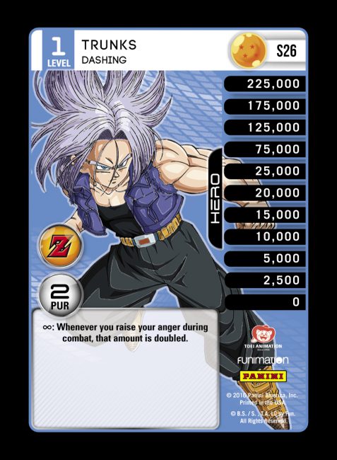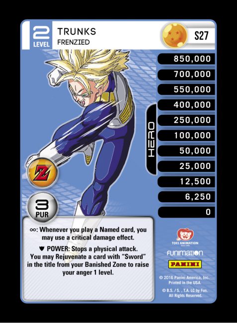 Trunks – Frenzied is one of few MPs with a defensive Power, and he activates to stop a physical attack. In an aggressive beatdown environment, Trunks Level 2 can pair with Saiyan Dynamic Mastery to form a robust defensive strategy. His other abilities staple together most of his themes, grabbing Sword cards from the banished zone for anger and turning his wide array of named cards into powerful Crit bombs.