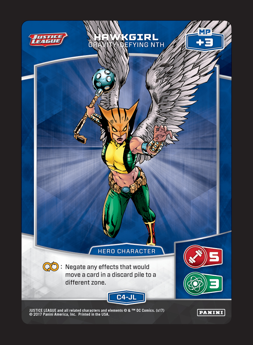 Hawkgirl completely shuts down any discard pile shenanigans, whether it be Deadman trying to add a Battle Card to a player’s hand or Rebirth attempting to shuffle cards back. This effect is a welcome floodgate against the likes of Ra’s al Ghul and Starfire, while also providing an intriguing option for mill decks to block regeneration.