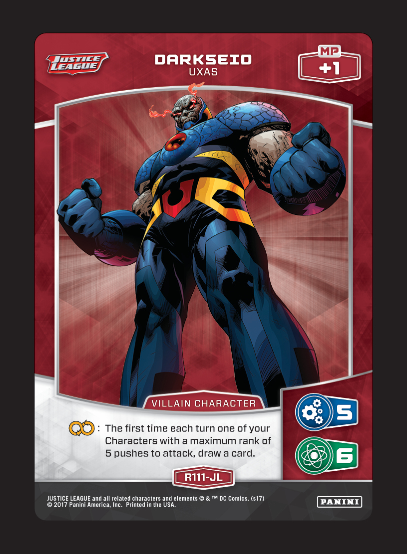 Some decks based around Rank 5 Characters contain a handful of Rank 6 or 7 Characters, and Darkseid – Uxas is one of the most potent examples. Characters with a maximum Rank of 5 often lend themselves to rushdown strategies, which require a constant stream of Battle Cards to fuel attacks. Though Darkseid’s effect does nothing without an active teammate, his sustained presence can ultimately generate a substantial amount of card advantage.