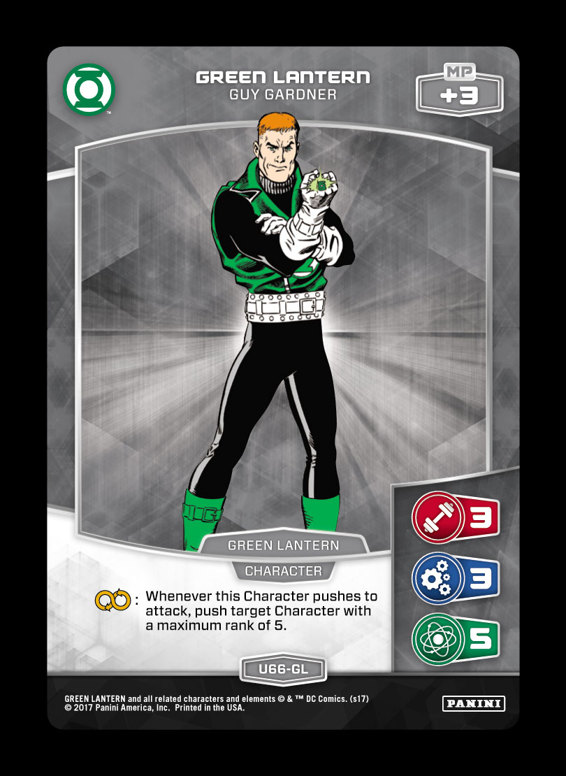 Guy Gardner’s effect primarily pauses small defenders to create VP opportunities, while also denying the opponent the ability to generate MP through Battle Cards or free up board space by sacrificing a Character to damage.