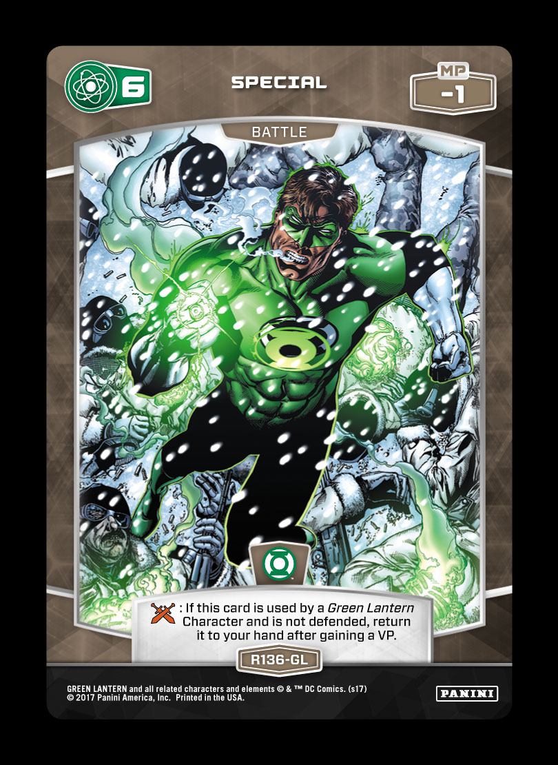 The diversity of Stats available to Green Lantern decks serve to create some powerful Battle Card lineups, including several stamped effects. Here, the effect of this 3 Strength can keep a damaged Character from being sent out to defend that turn – but only if you control a Green Lantern Trait.