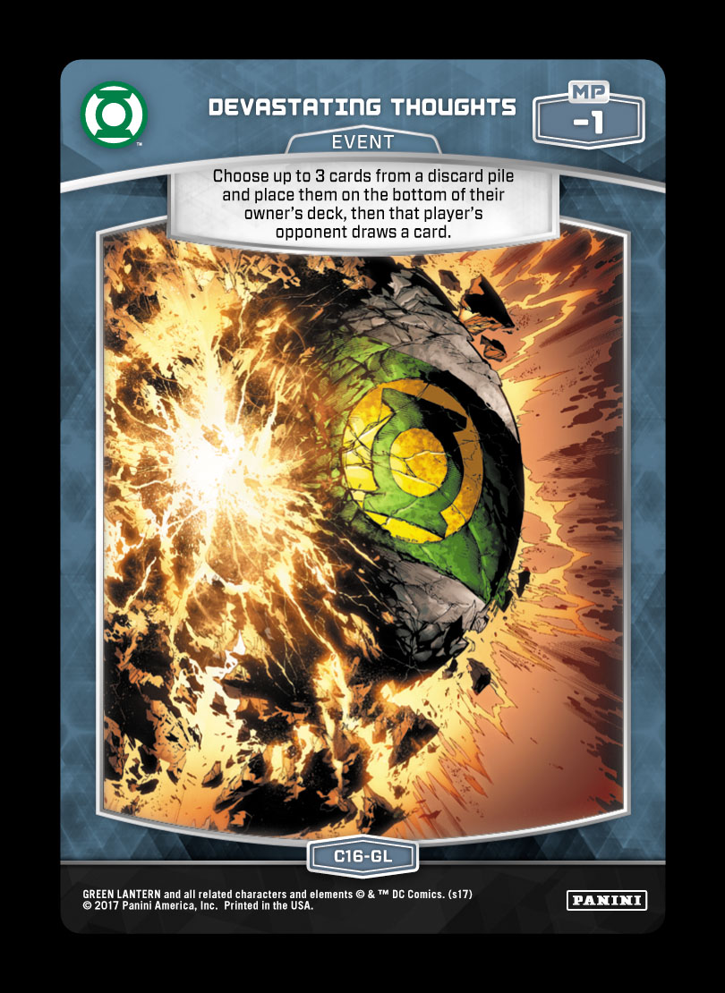 - Devastating Thoughts (C16-GL): This card has a minor misprint, and a reprinted version with the correct text will be included in a future release. Treat this card as if it reads “Choose up to 3 Battle Cards from a discard pile…”