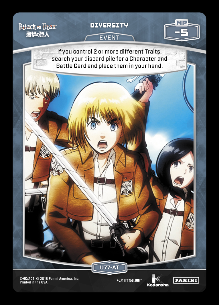 At its core, this is a resilient Character lineup that includes enough Traits to utilize 7 Special. Aside from the virtual advantages generated by high HP Characters throwing large Battle Cards, Mikasa is able to quickly find the 7 SP – which can then be pulled back by cards like Diversity and 3 Special. For the most part, the deck should aim to overwhelm the opponent with the sheer size of its attacks, the resilience of its Characters, and its consistent card advantage on all fronts.
