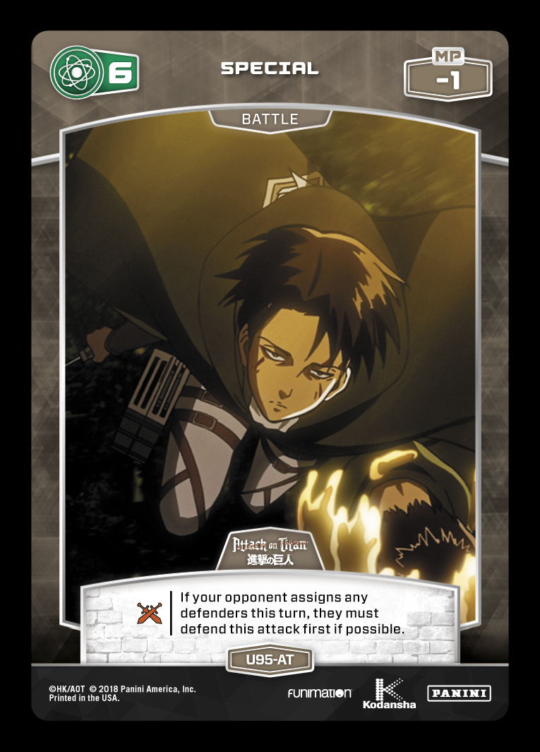 When declaring an attack, you’ll usually need to consider your opponent’s potential to defend – as well as the aftermath of each possible outcome. This effect is one of the few in the game that can disrupt your opponent’s ability to block, and it comes on a Battle Card with a low MP cost and high Rank. This can be utilized to direct a defender away from a specific Character (such as a damaged Character that you don’t want KO’d, or a Character that benefits from gaining VPs), while ideally soaking up attacks into a larger Character (such as Eren Jaeger – Mysterious Titan). In general, this unique effect can put the opponent in a tricky situation – as evidenced by the ruling inquiry below!