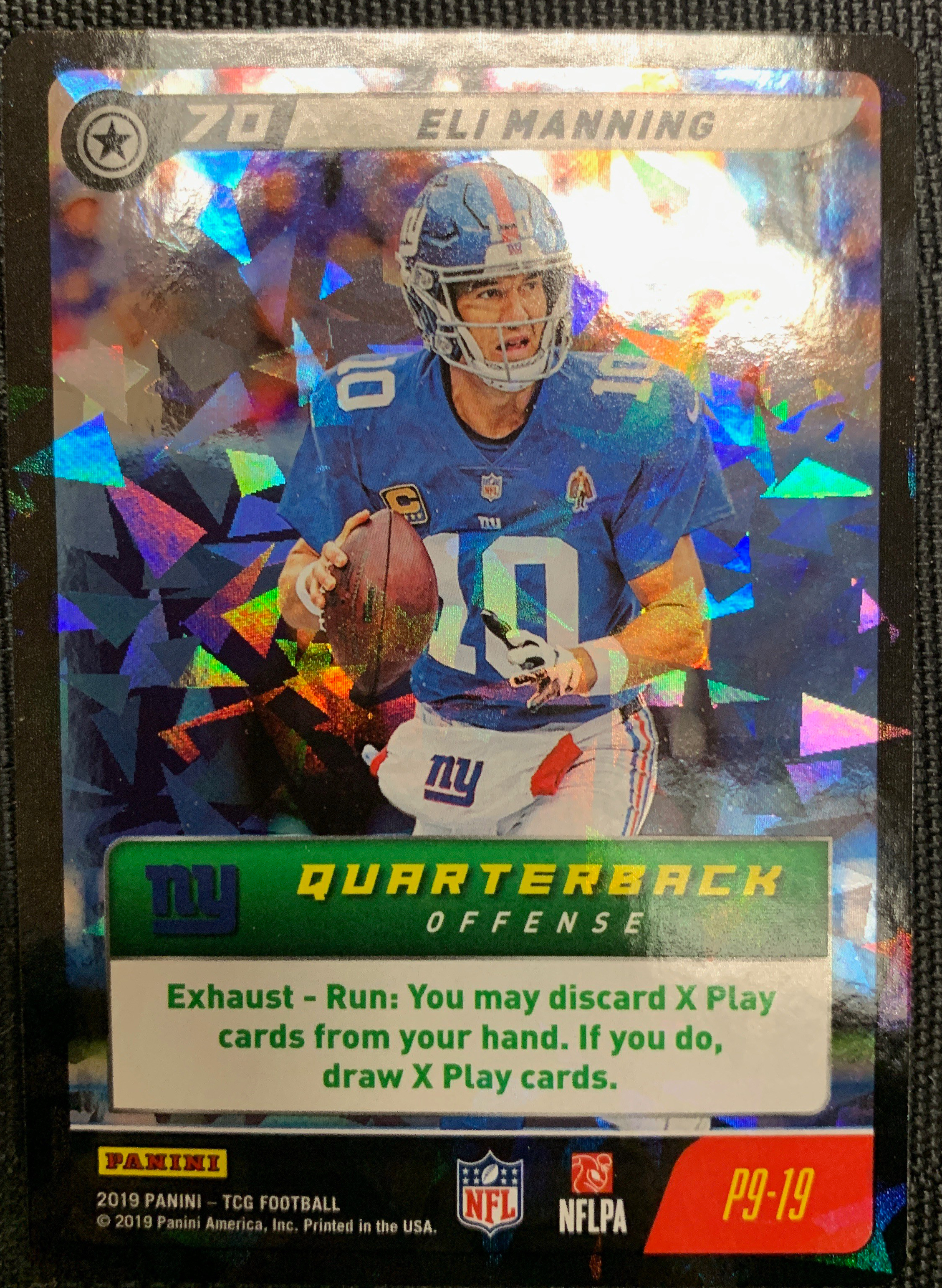 The NFL Five TCG is now available in hobby shops across the nation – and tournament support is on the way! “Early bird” stores will receive foil Eli Manning (P9-19) promo cards upon request: