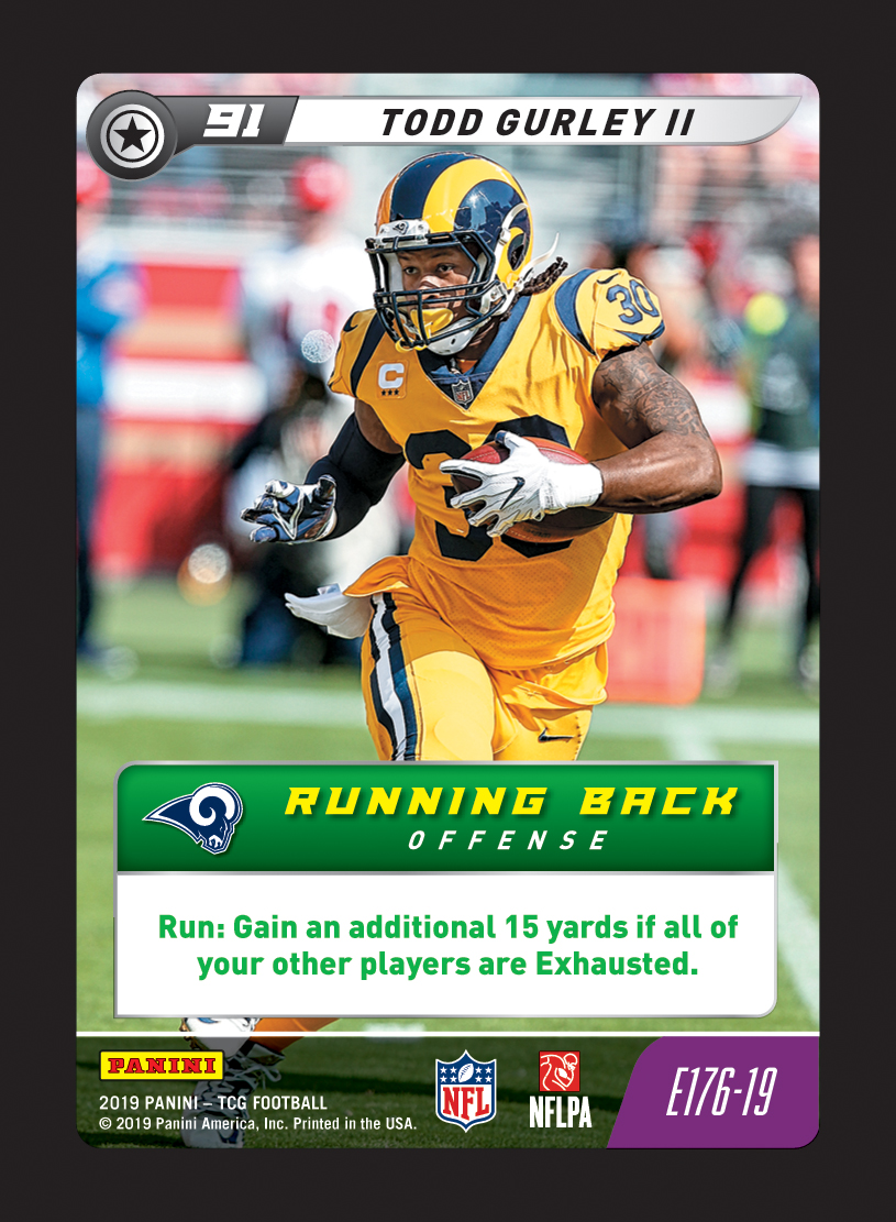 Though Dak Prescott’s effect has no quantitative value when compared with Quarterbacks that add yardage, his ability to gain knowledge of the opponent’s hand can allow for more unstopped Plays (and thus potentially generate more yards overall). Dak’s “S” Rarity makes him a standout in various draft formats, including synergy with effects that require your entire team to be exhausted (such as Todd Gurley II). Finally, consider this card’s application in dual-QB lineups for other potential combos.