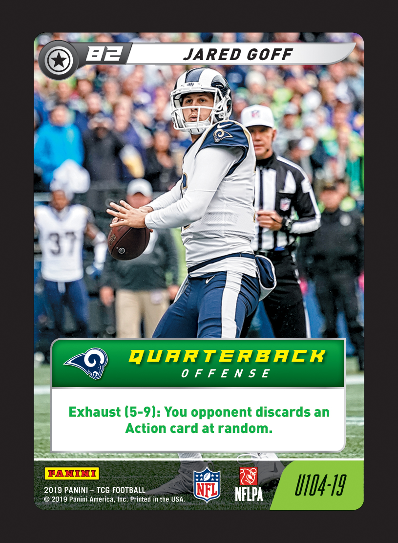 While some of the hardest hitting discard effects (such as Patrick Onwuasor) have a narrow chance of success, Jared Goff’s 5-9 range will allow you to consistently discard Action cards from the opponent’s hand. When utilized in a deck with other automatic discard effects (such as Josh Allen or Earl Thomas III on defense), Goff’s ability becomes even more useful – with the potential to lock your opponent out of Actions for the majority of the game! Restricting your opponent’s Action cards can create a huge advantage during On Field Adjustments, allowing you to reliably set up (or deny) a string of pre-planned plays.