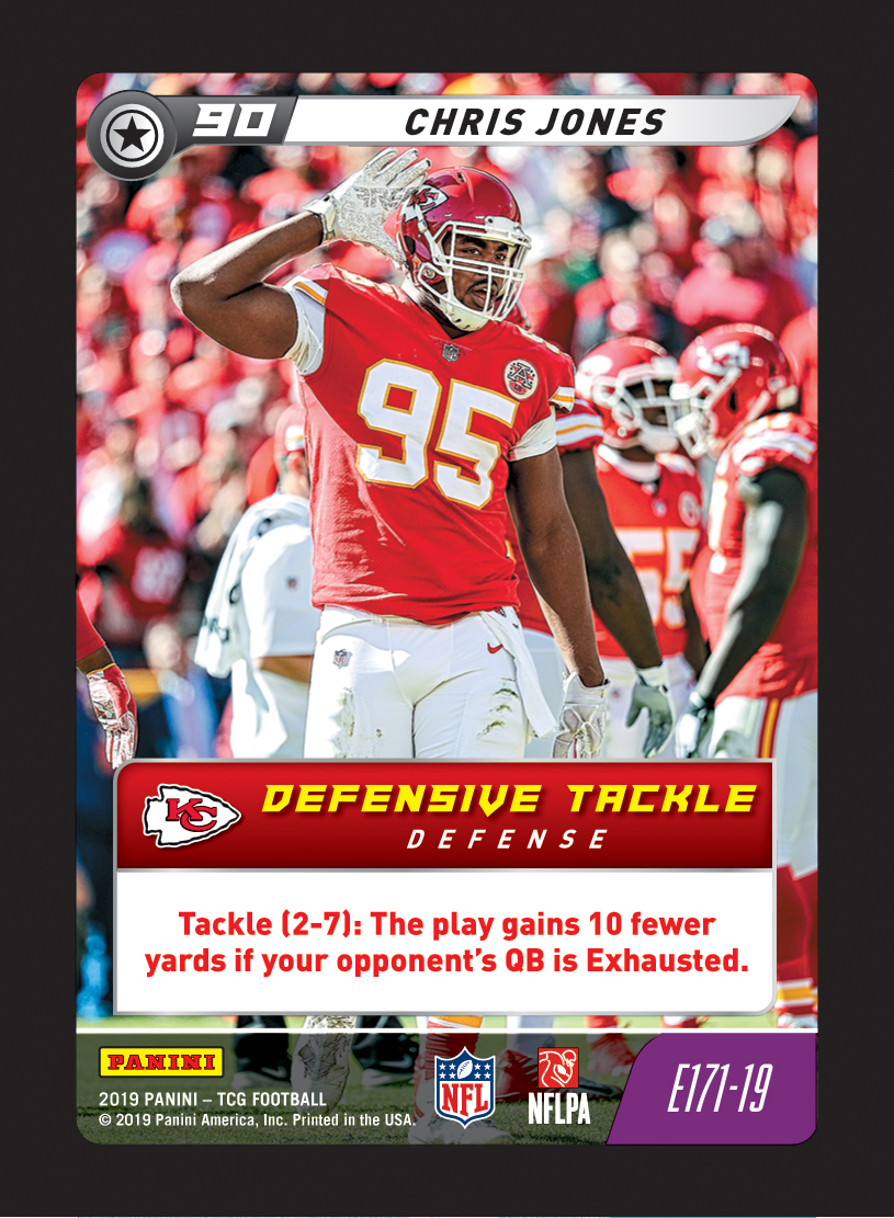 The NFL offseason is underway, and Kansas City’s Chris Jones is likely to be a top target in free agency. For gameplay purposes, E171-19 Chris Jones offers a consistently applicable effect – though his ability does require some planning to activate. In order to add an element of control to this card, look to pair him with defensive Exhaust effects like Everson Griffen.