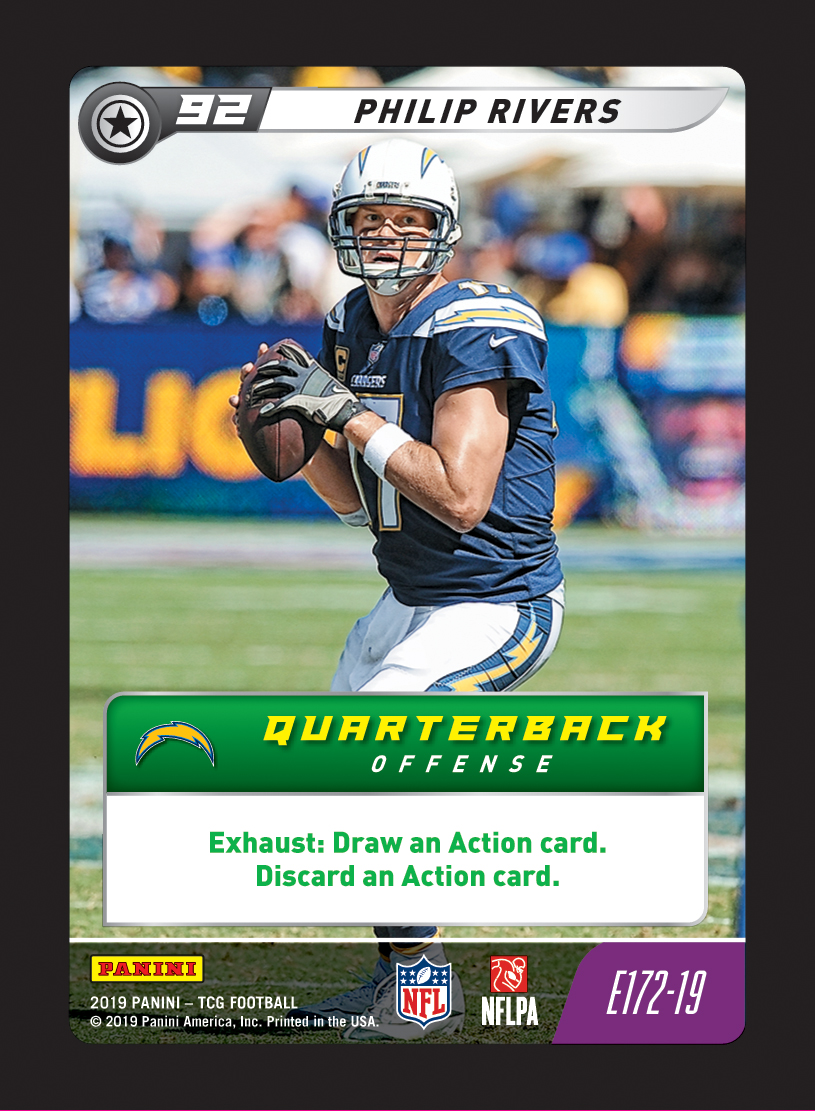 Philip Rivers is moving on from the Los Angeles Chargers, but his 2019 season remains immortalized in NFL Five! E172-19 Philip Rivers filters through your Actions at double the normal rate, allowing you to assemble combos – or simply dig for a given card. Look to combine this effect with Characters that further manipulate Action Cards, such as S47-19 Terrell Suggs or other Quarterbacks (like Sam Darnold and Jameis Winston).