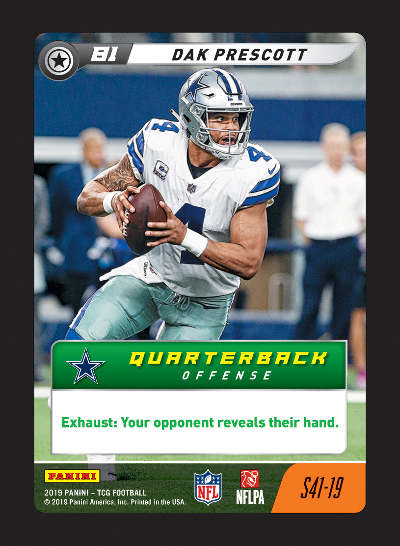 Dak Prescott is likely to remain a member of the Dallas Cowboys, but that won’t stop fans of other teams from dreaming! In NFL Five, you’re free to combine S41-19 Dak Prescott with any other Players you choose – including more Quarterbacks. Dak’s ability provides perfect knowledge of the opponent’s hand, allowing you to determine which of your Plays have the best chance to succeed. Since this enables successful Plays (at the cost of an ability that adds yards or cards), look to maximize this effect with high yardage Players like Le’Veon Bell and Julio Jones.