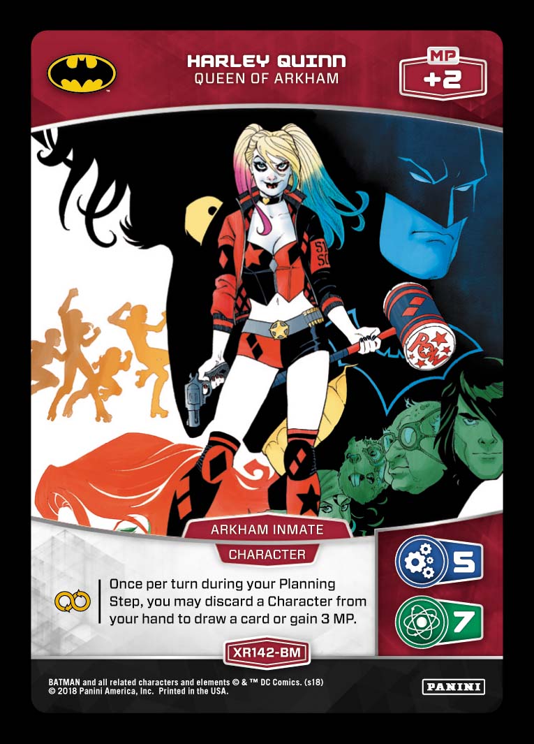 Harley Quinn has been a popular Character since the first set of MetaX, with both Dr. Harleen Quinzel and Former Psychiatrist making an early mark on the metagame. Queen of Arkham offers a rank 7 variant of Harley, and her flexible ability is able to generate value in nearly any scenario. This effect allows your deck to run more situational Characters that can be filtered away when needed, with the option of MP smoothing to boot. While she is able to set up stamped effects for Arkham Inmates teammates, she is more at home in rainbow Midrange builds.