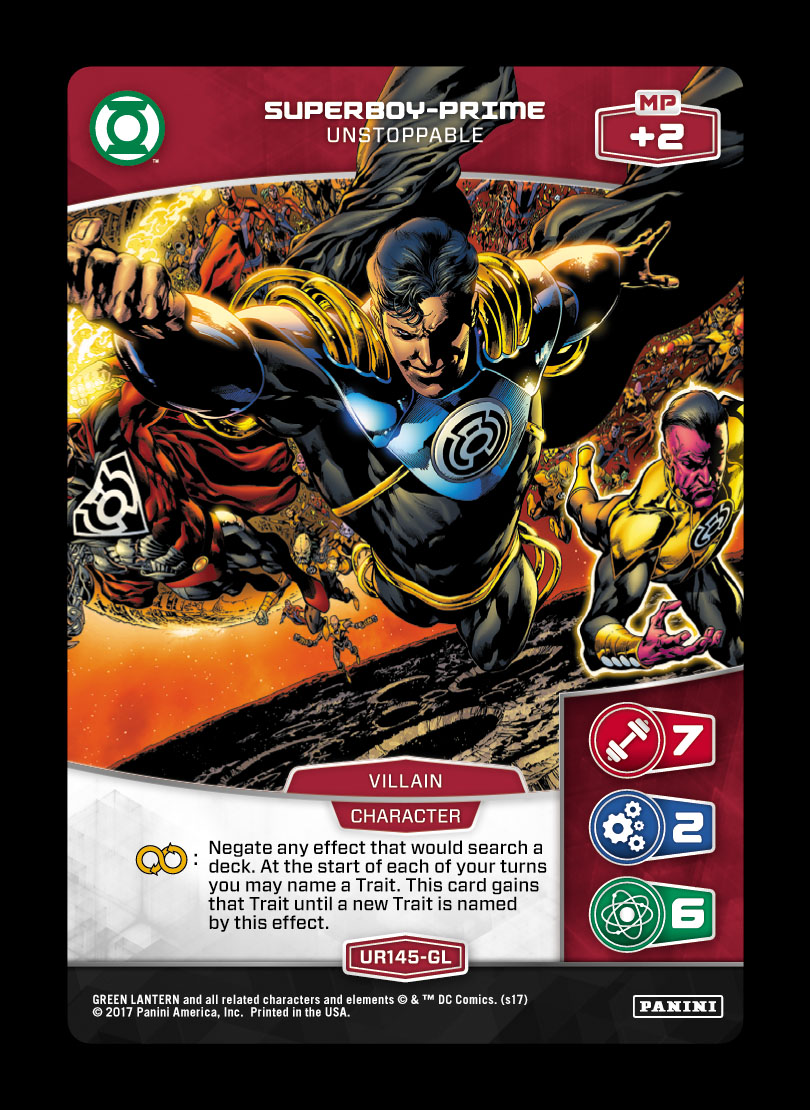 Winners of this week’s giveaway will receive a Booster Box of Green Lantern, and Superboy-Prime is one of the top cards from the set. His negation effect can disrupt a significant portion of top tier decks, and his chameleon Trait ability allows him to fit into any heavily-stamped build. While this card has primarily seen success in Titan builds, it is worth consideration in any deck that is not reliant on its own search effects.