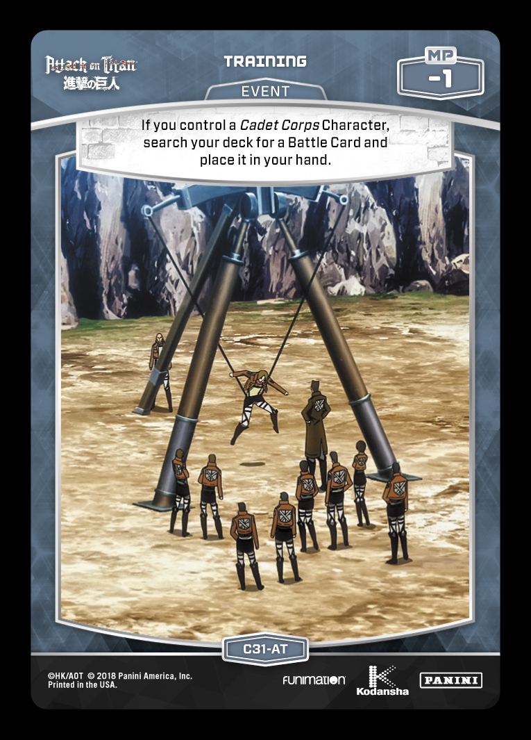 Last week’s poll results saw the Cadet Corps come in second place, and Ymir – Freckles is one of the best “build around” effects in the Trait. Since many Scout Regiment decks are based around Team Attacking, Ymir can easily slip in and generate card advantage by recurring Intelligence Battle Cards like 5 Intelligence (U92-AT). When splashing Ymir into a Scout Regiment list, also consider utilizing stamped Events like Devastation and Training.