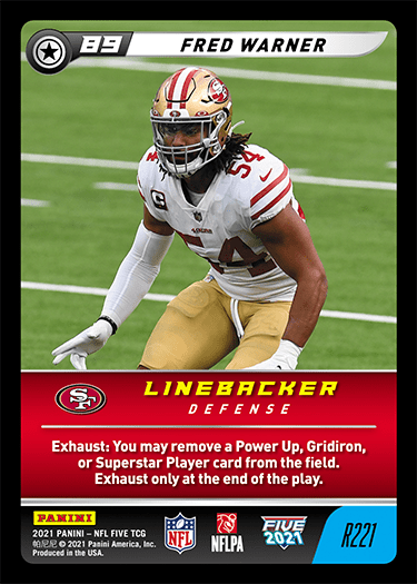 Fred Warner (R221) was selected in the first round of a recent fan draft, placing him alongside the likes of powerhouse QBs and other Epic/Legendary Players. This versatile effect offers an immediate answer to any of your opponent’s cards that remain in play, allowing you to disrupt their central strategies (or provide yourself insurance against harmful symmetrical effects). On top of that, consider potential combo applications when using this ability to remove your own cards from the field!