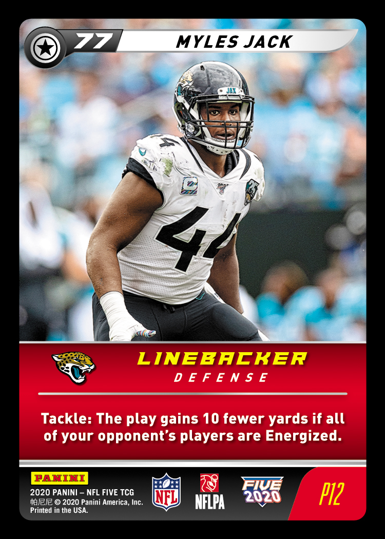 Tomorrow’s NFL Five Free Play event takes place from 3-5 CST on Zoom (invite here). All virtual attendees will receive four promo cards of their choice, with P12 Myles Jack an P19 Saquon Barkely newly added to the pool!