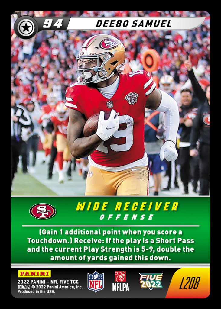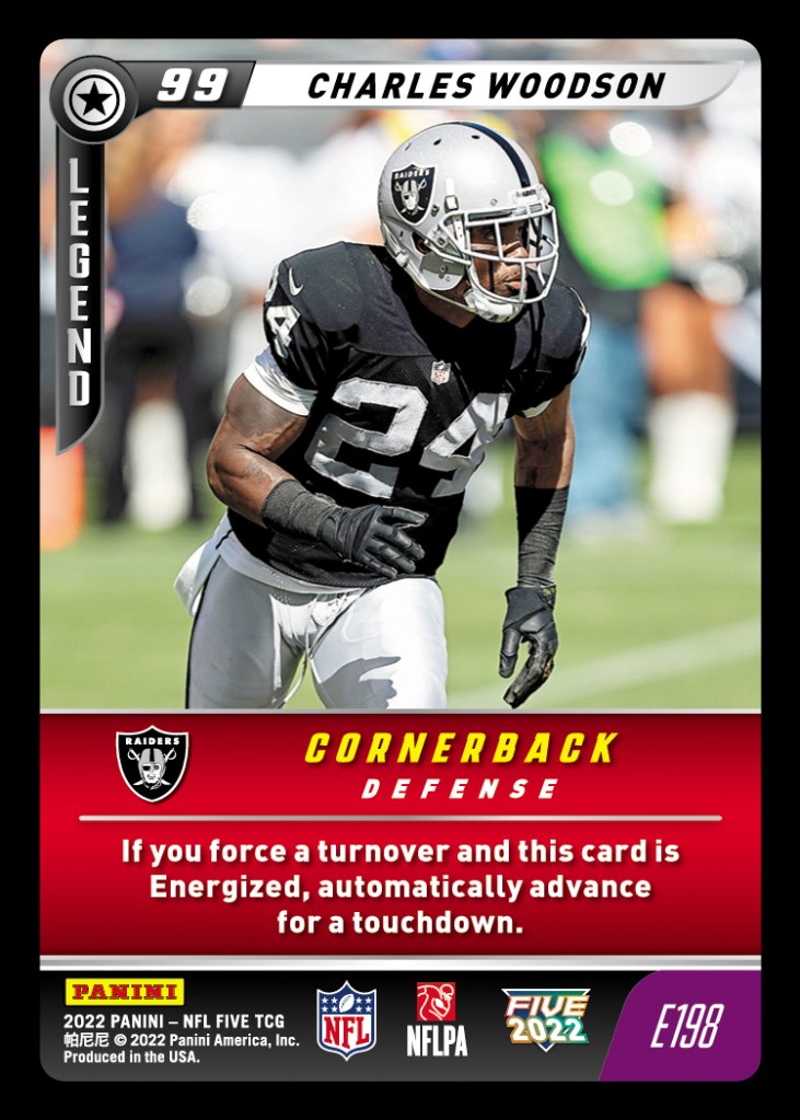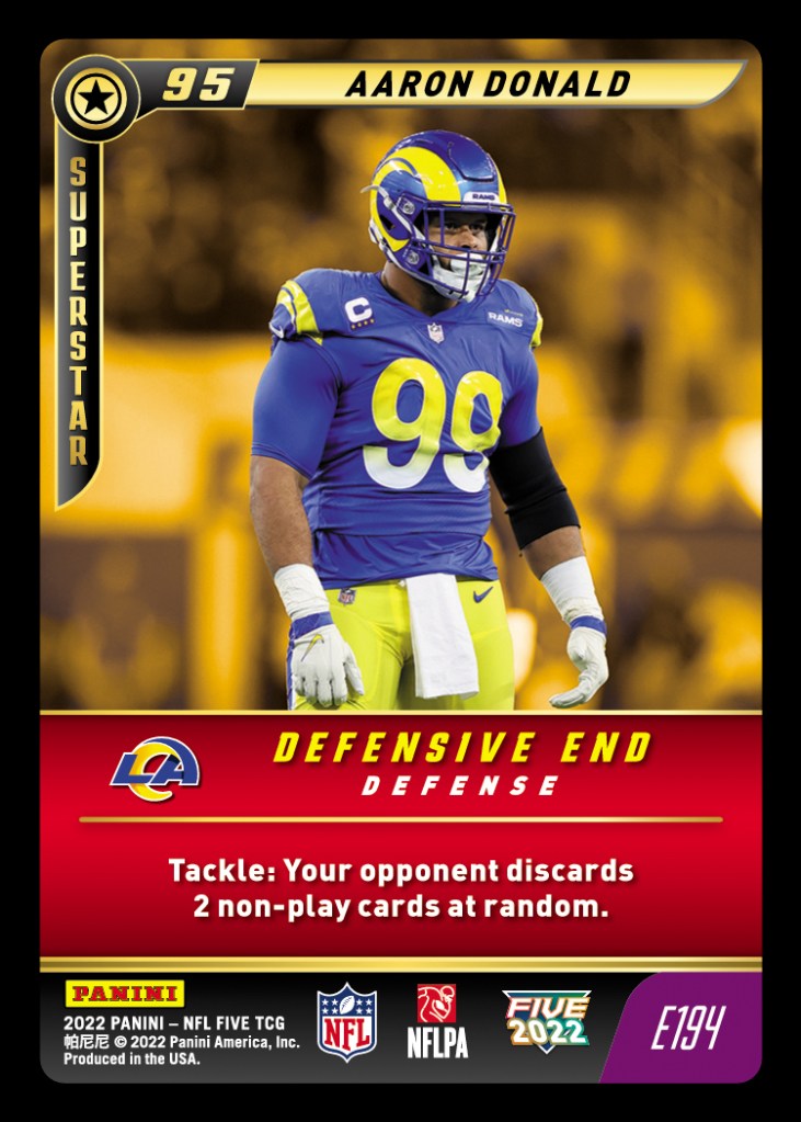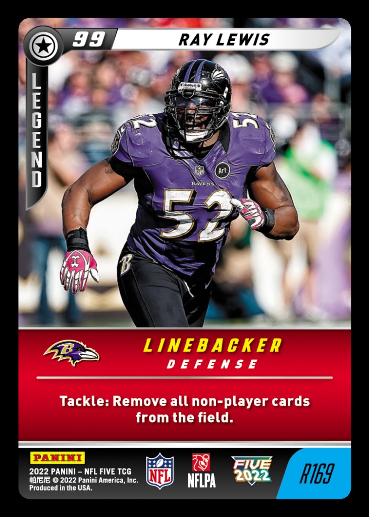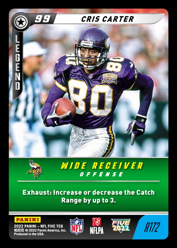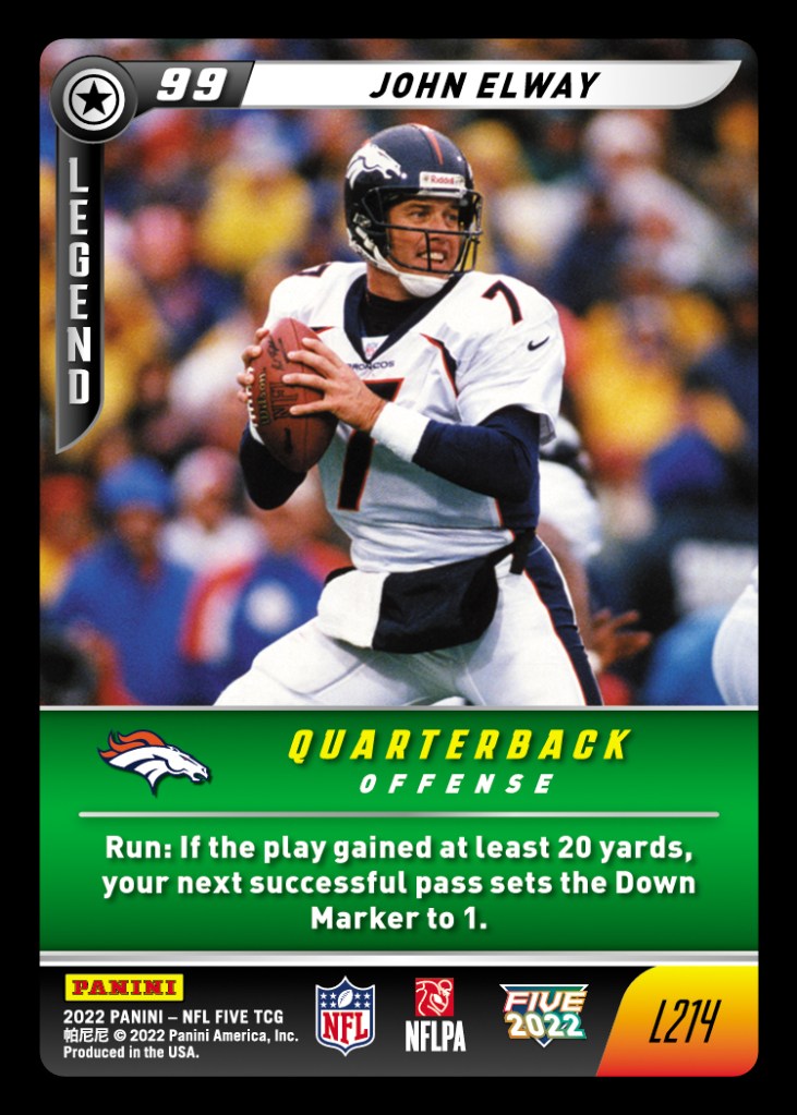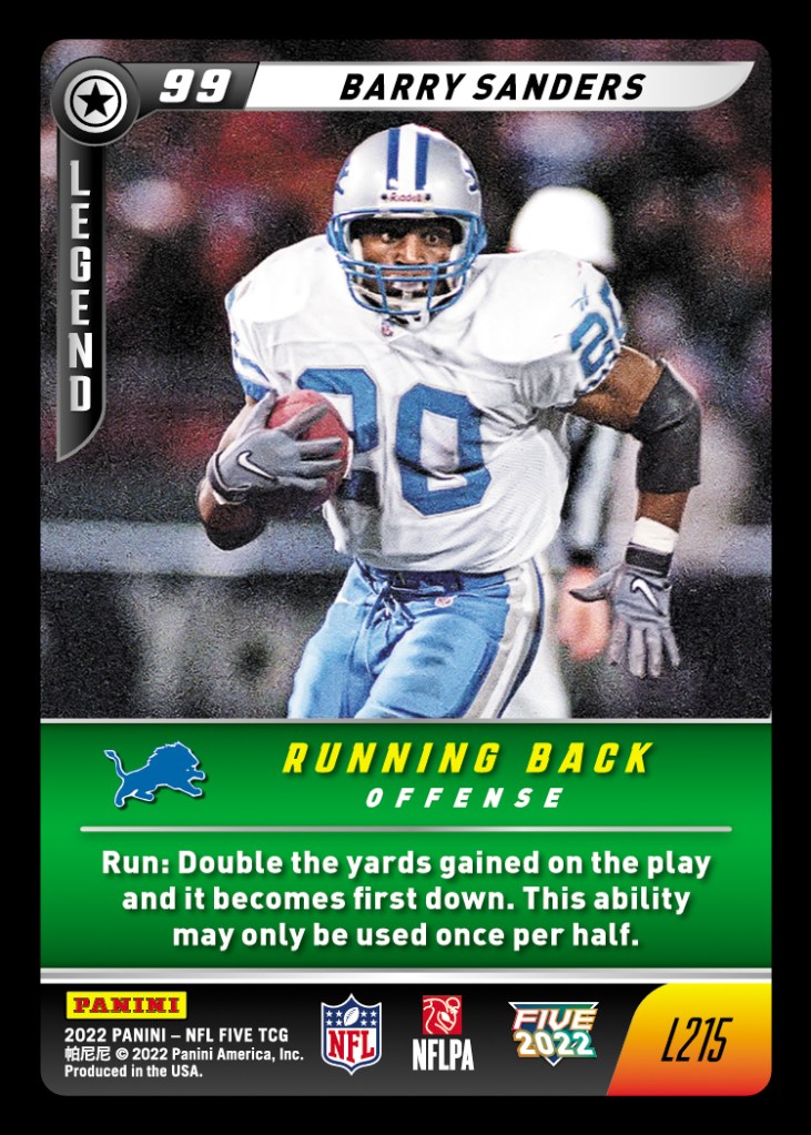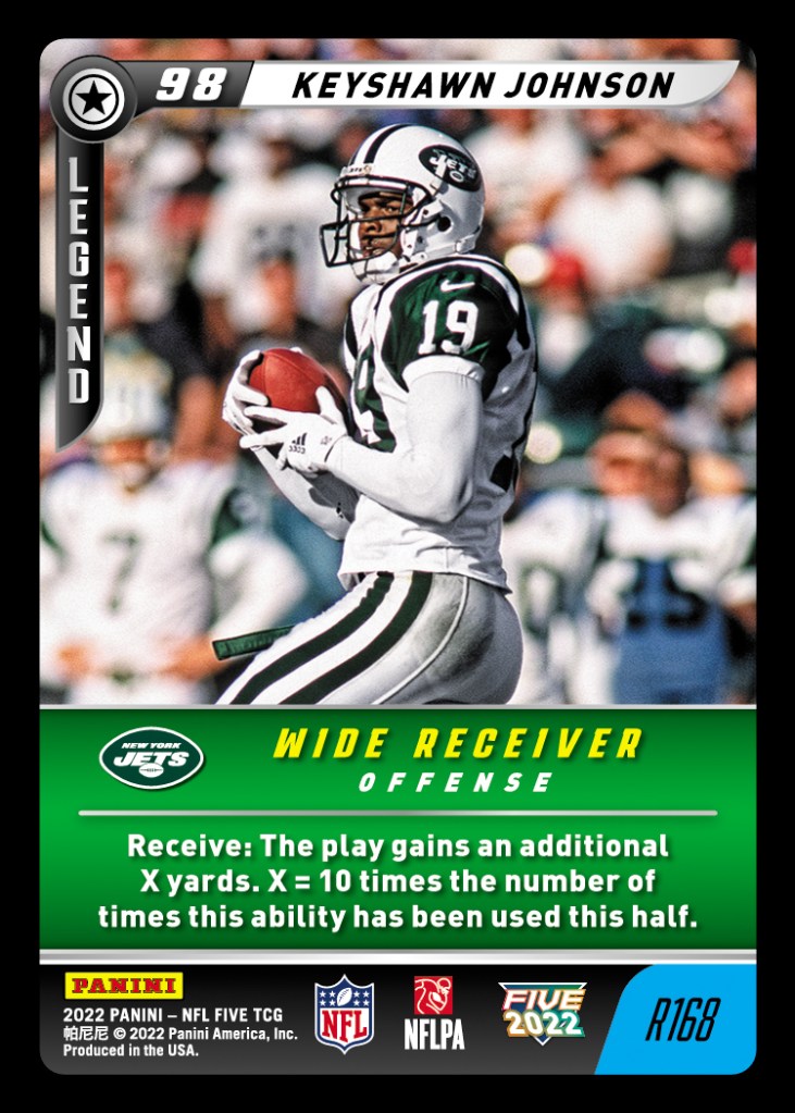 For the first time, retired players are joining the fray! There are sixteen retired Legend cards in NFL Five 2022, and various effects interact with the “Legend” subtype.