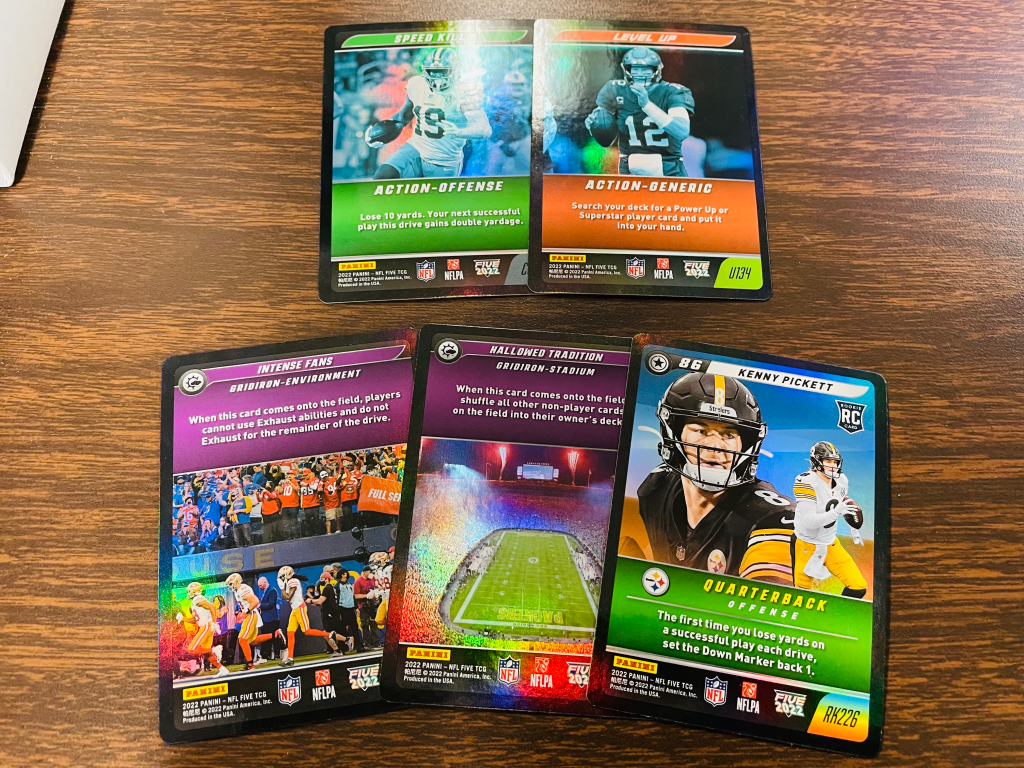 The full checklist (including promo cards) for NFL Five 2022 can be seen here. NFL Five 2022 is currently rolling out to retail chains (like Target) and local hobby stores!This set introduces a Rainbow foil pattern – see a preview below, and check back on Friday for the start of our NFL Five 2022 launch giveaway!