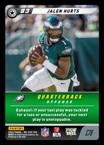 Jalen Hurts is headed to the Super Bowl, and his rarity is sure to receive a massive upgrade in the 2023 set! In the meantime, C78 Jalen Hurts can set up unstoppable plays for huge gains (and this can potentially be used more than once per drive). Though this effect is conditional, it can often ensure a Touchdown – and it is further augmented the Philadelphia Eagles Synergy card!