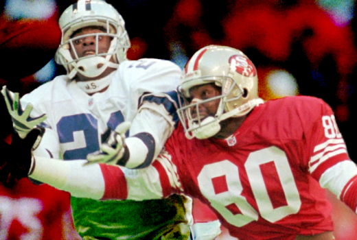 “Legend” cards are retired players with a special subtype icon – such as Jerry Rice, Barry Sanders, and fourteen others in NFL Five 2022.