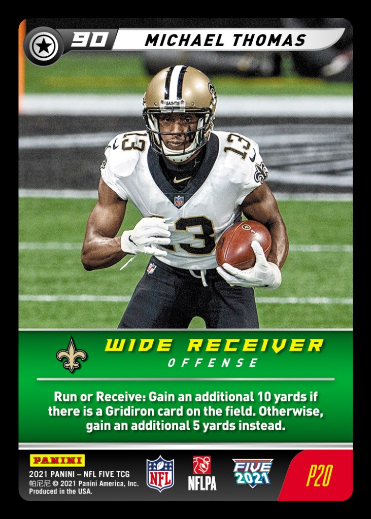 April’s NFL Five Free Play event takes places tomorrow from 3-5 CST on Zoom (invite here). Stop by to chat and spectate – or participate in a webcam match yourself! All virtual attendees will receive four promo cards of their choice, with P20 Michael Thomas and P10 Nick Chubb joining this month’s pool: